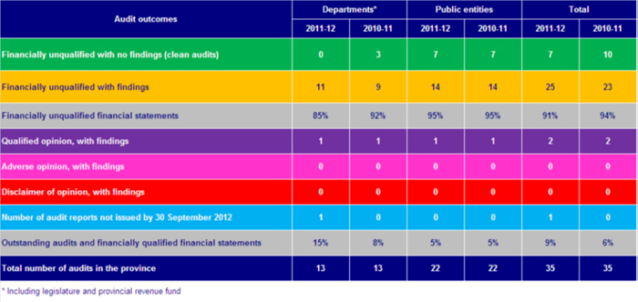 With the exception of seven public entities that stringently implemented remedial administrative plans to achieve clean audits, the overall 2011-12 audit results for Gauteng have regressed, including those of the Gauteng Office of the Premier and the Gauteng Provincial Legislature, Auditor-General (AG) Terence Nombembe announced today.